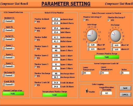 Before starting the test, we need to set the parameters in Setting window as per the type of compressor. First we need to configure the channel to monitor the temperature at various locations with in the compressor. For loading the Compressor, we used a flow control valve. For calculation of FAD (Free Air Delivery), we used pressure sensor at both side of the Nozzle and FAD has been displayed in Lpm on the screen.